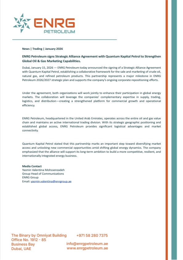 ENRG Petroleum signs Strategic Alliance Agreement with Quantum Kapital Petrol to Strengthen Global Oil & Gas Marketing Capabilities.