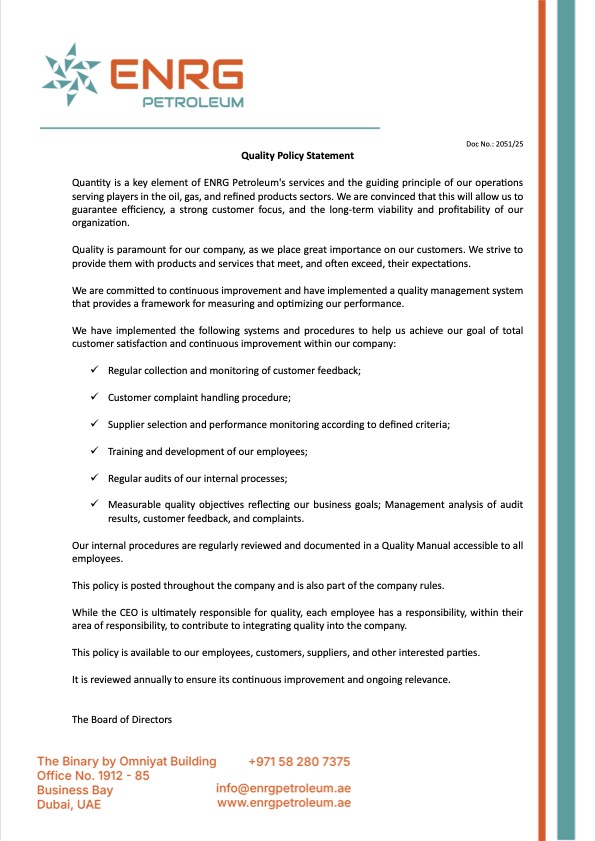 ENRG Petroleum is dedicated to operational efficiency and total customer satisfaction. Our Quality Policy outlines our commitment to continuous improvement through rigorous performance monitoring, regular internal audits, and employee training. We strive to not only meet but exceed client expectations in the oil and gas sector, making quality a shared responsibility across our entire organization.