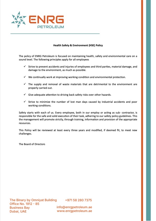 ENRG Petroleum is committed to maintaining the highest standards of health, safety, and environmental care. Our policy focuses on preventing accidents, minimizing environmental impact, and ensuring safe working conditions for all employees and subcontractors. We enforce a culture where safety is a shared responsibility, supported by management through comprehensive training and resource allocation.